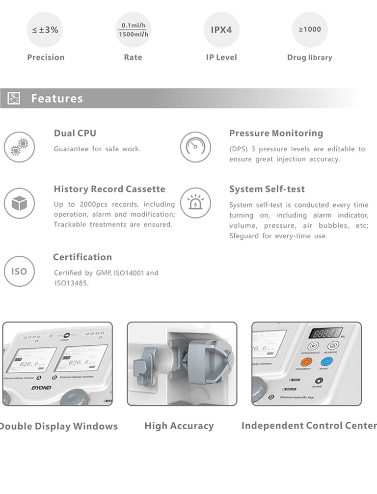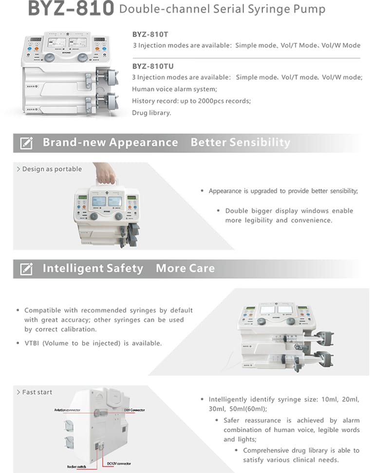 Infusion Rate | 50(60)ml Syringe 0.1ml/h---999.9ml/h(0.1ml/h step) 1000mh/h---1500ml/h (1ml/h step) 30ml Syringe 0.1ml/h---900ml/h(0.1ml/h step) 10ml Syringe 0.1ml/h---300ml/h(0.1ml/h step) |