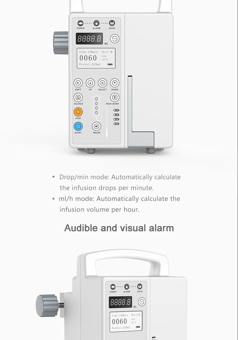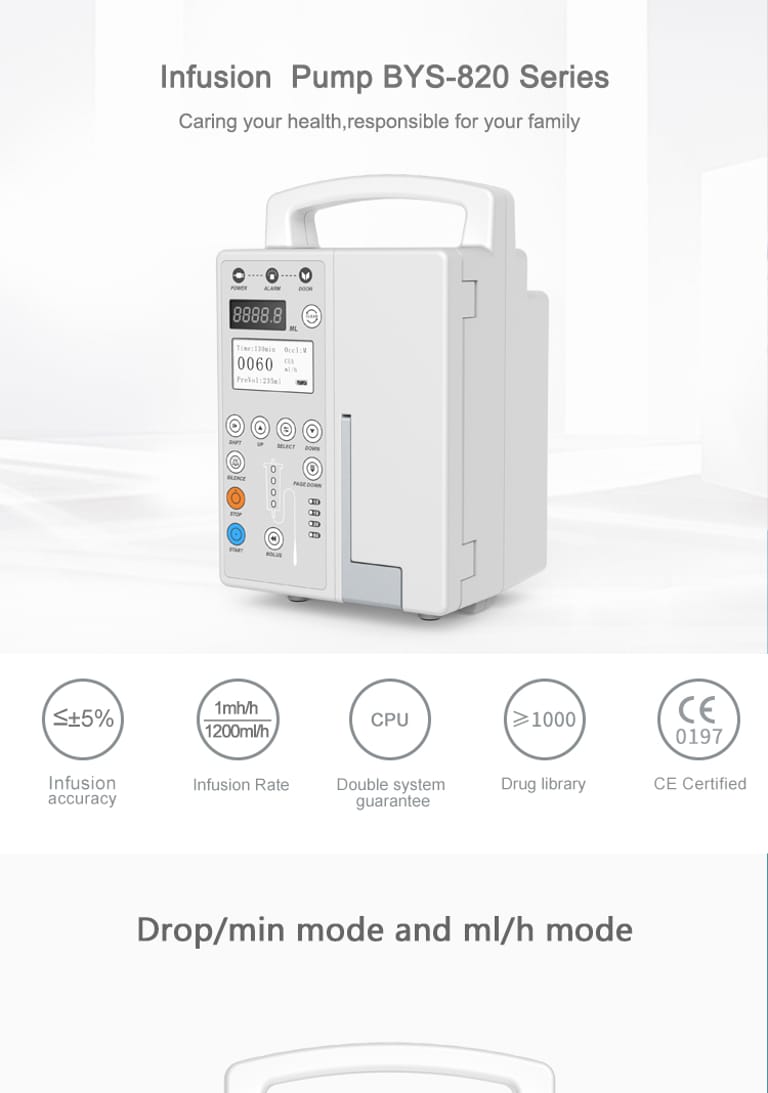 Infusion Rate | ml/h mode:1~1200ml/h(1ml/h step) drop/min mode:1~266drop/min(1drop/min step) |